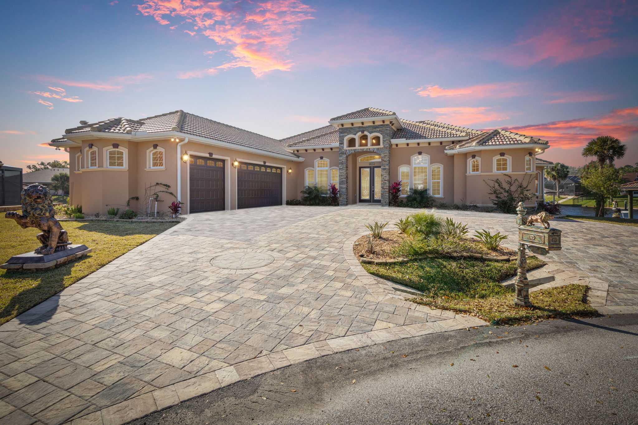 The regal circular paver driveway, adorned with majestic copper lion statues, sets the tone for the exterior's stacked stone accents and durable concrete tile roof, reflecting the exceptional quality of this home. Adding practicality, a spacious three-car garage provides convenient parking and storage.